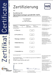 VdS Zertifizierung als Fachfirma für Sprachalarmanlagen DIN 14675